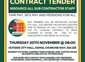 RMT Members will be protesting outside City Hall, Just before the Mayor’s Question Time to demand TFL halt the Tendering of the TFL Cleaning Contract, to bring cleaners in house, an...