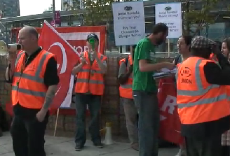 RMT cleaner members working for Initial and ISS demonstrated outside the Olympic Park at Stratford Station on August 9, 2012 as they kick off a 48 hour strike for pay justice and Olympics recognition. Filmed and edited by Andrew Brattle.