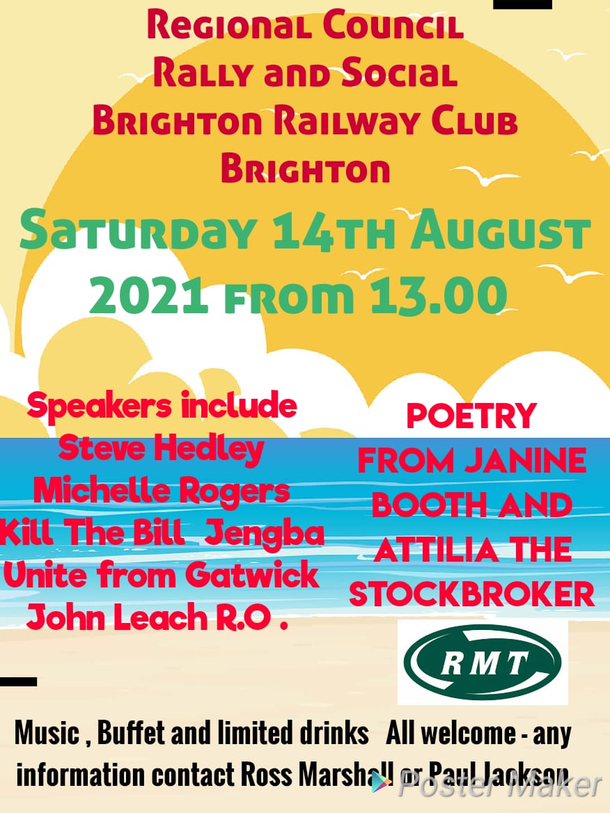 RMT members join us for the Brighton Rally. There will be music, buffet and refreshments. Check out the details in the poster attached.